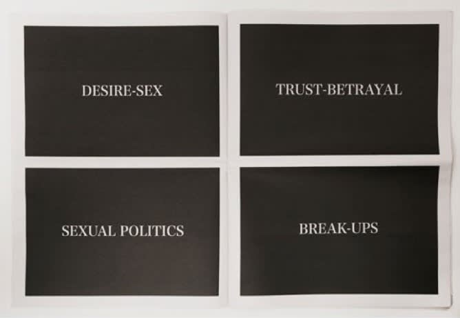 Unlike Christian Marclay’s celebrated 24-hour epic installation The Clock, Love Sounds withholds (or “dematerializes”) the images of the films it samples, leaving viewers to either paint from memory or imaginatively overlay these scripted pop-cultural sounds with a more personally resonant set of visuals. The only image Love Sounds gives us is a black screen with white titles that gesture toward each chapter’s organizing principle: HEARTBREAK, or FATE-TIME-MEMORY, or TRUST-BETRAYAL.