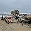 Photo taken May 10, 2022, showing portion of a collapsed house and debris in the ocean and on the beach at 24265 Ocean Drive, Rodanthe. (NPS Photo)
